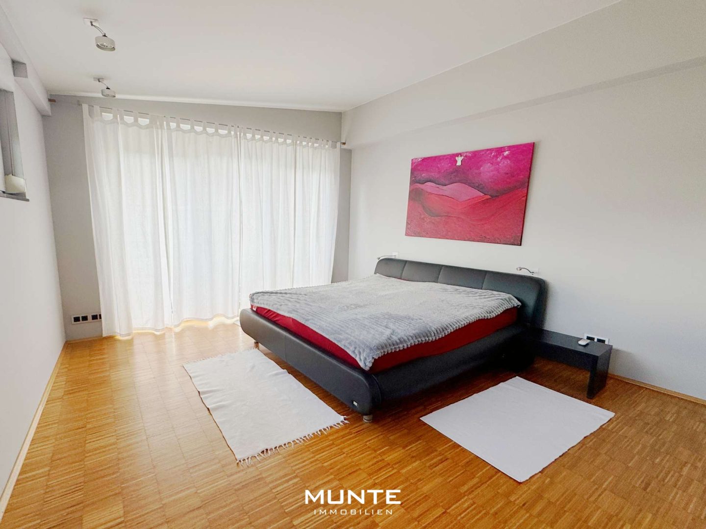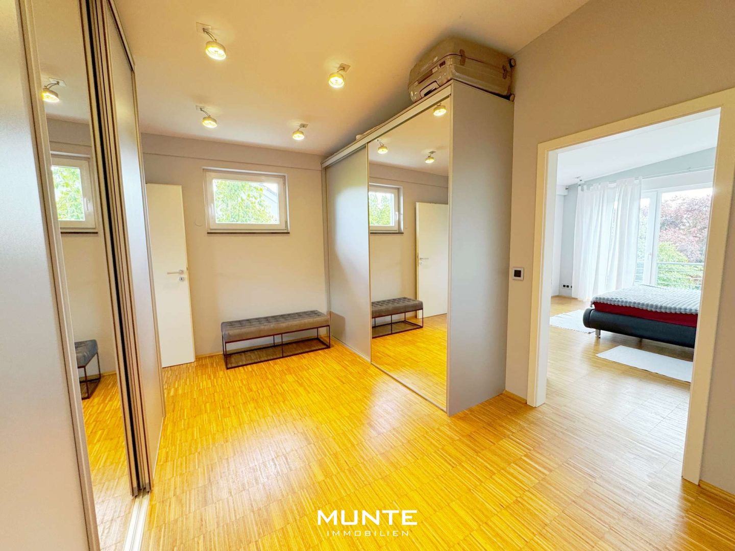 Über die stilvolle Treppe gelangen Sie zur Galerie im Obergeschoss, von der aus allen weiteren Räumen erreichbar sind. Der Elternbereich umfasst ein Schlafzimmer, ein großzügiges Ankleidezimmer sowie ein Badezimmer mit Dusche und Badewanne. Im zweiten Bereich befinden sich zwei weitere, gleichwertige Zimmer mit vielfältigen Nutzungsmöglichkeiten – als Kinder-, Arbeits- oder Gästezimmer. Eines der Zimmer bietet Zugang zu einem sonnigen Balkon mit Blick ins Grüne – perfekt für entspannte Stunden im Freien.
