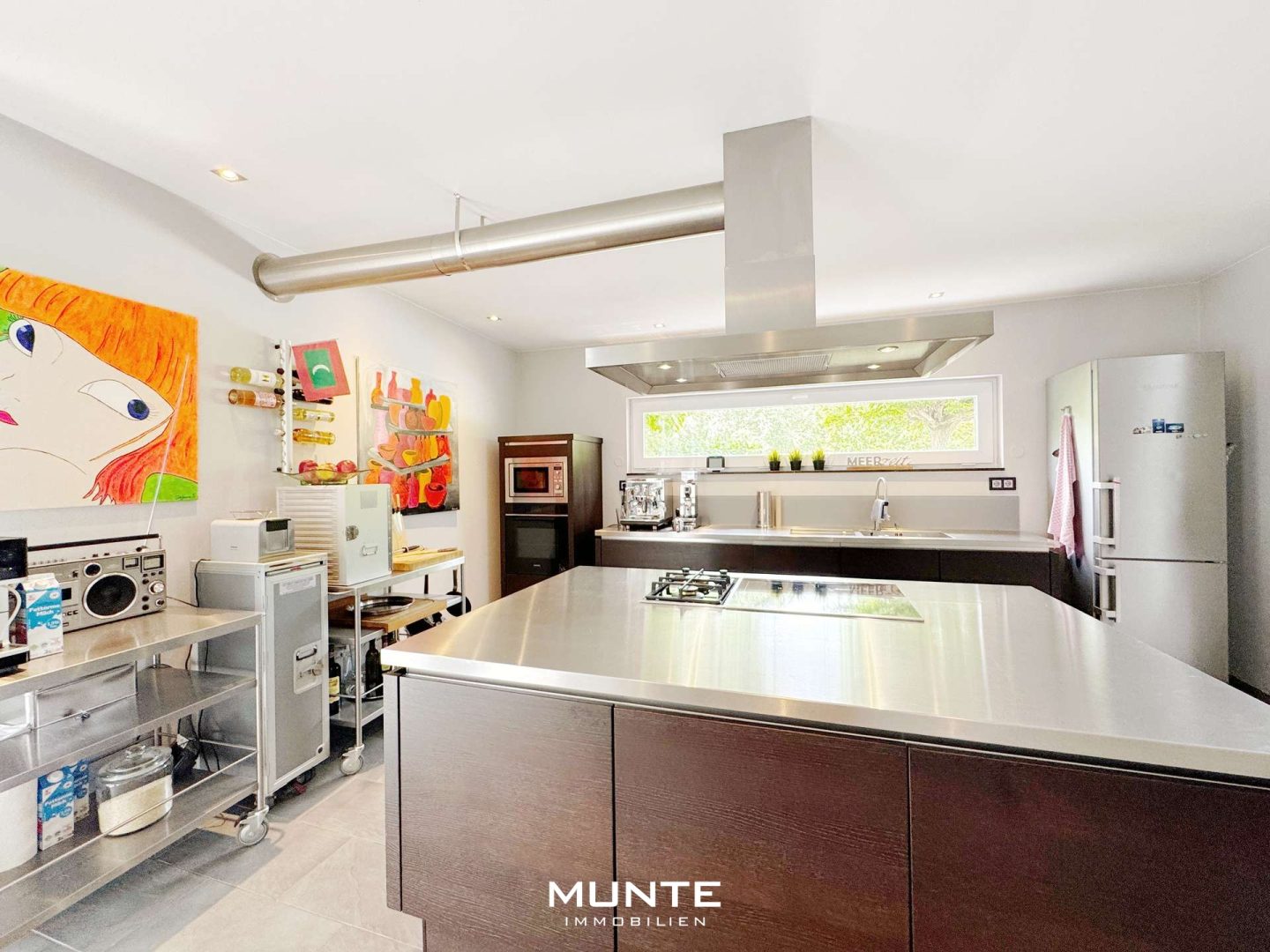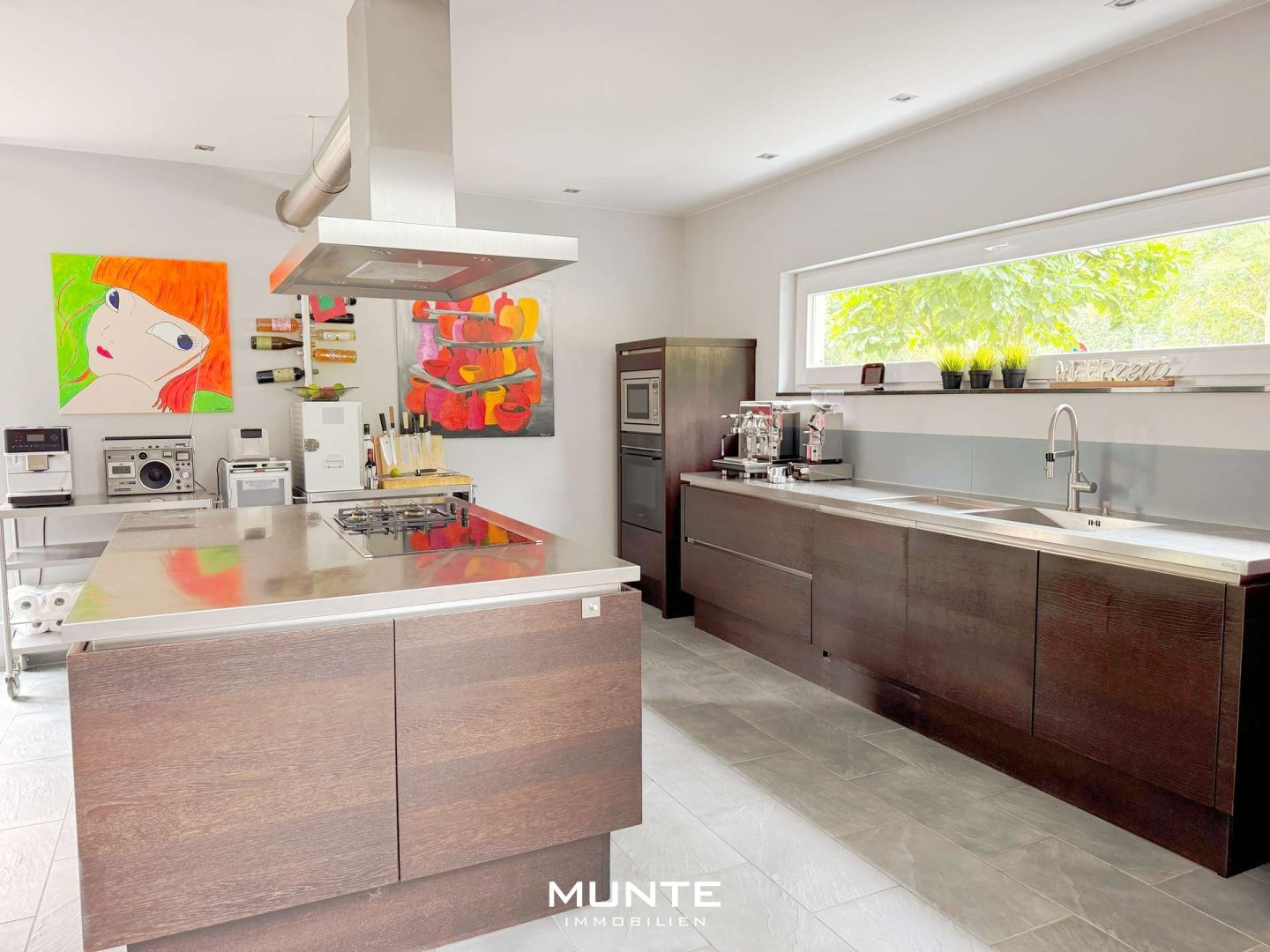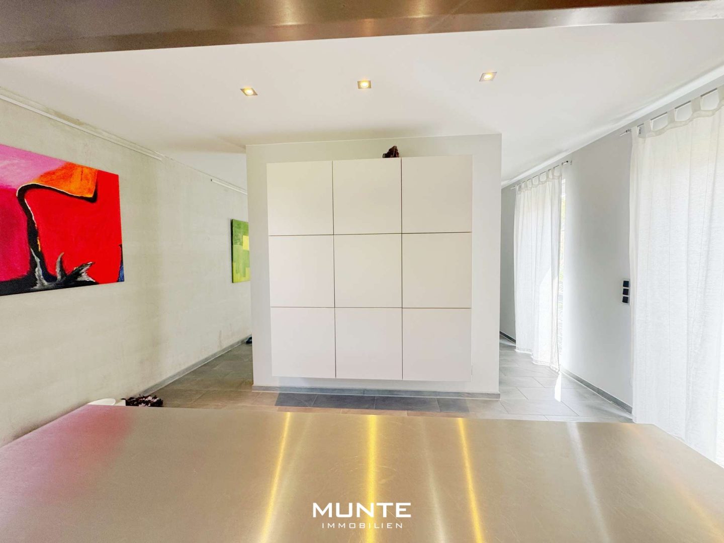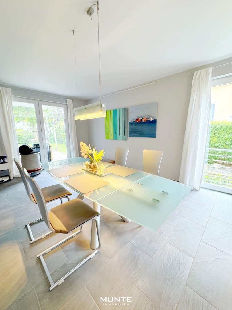 Rechts gelangen Sie in der offen gestalteten Küche mit angrenzendem Essbereich. Die Einbauküche in Holzoptik ist nicht nur modern und funktional, sondern bietet durch die großzügigen Fenster eine helle Atmosphäre. Dank des durchdachten Grundrisses gelangen Sie direkt ins angrenzende Esszimmer. Die stilvolle Sichtbetonwand sorgt hier für einen besonderen architektonischen Akzent, während ausreichend Platz für einen großen Esstisch gesellige Abende mit Familie und Freunden ermöglicht. Von hier aus führt eine Tür auf eine der beiden Terrassen mit Gartenblick.