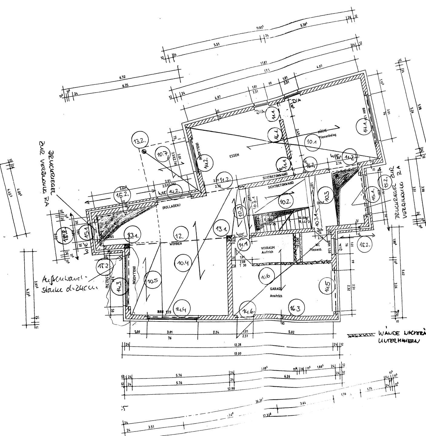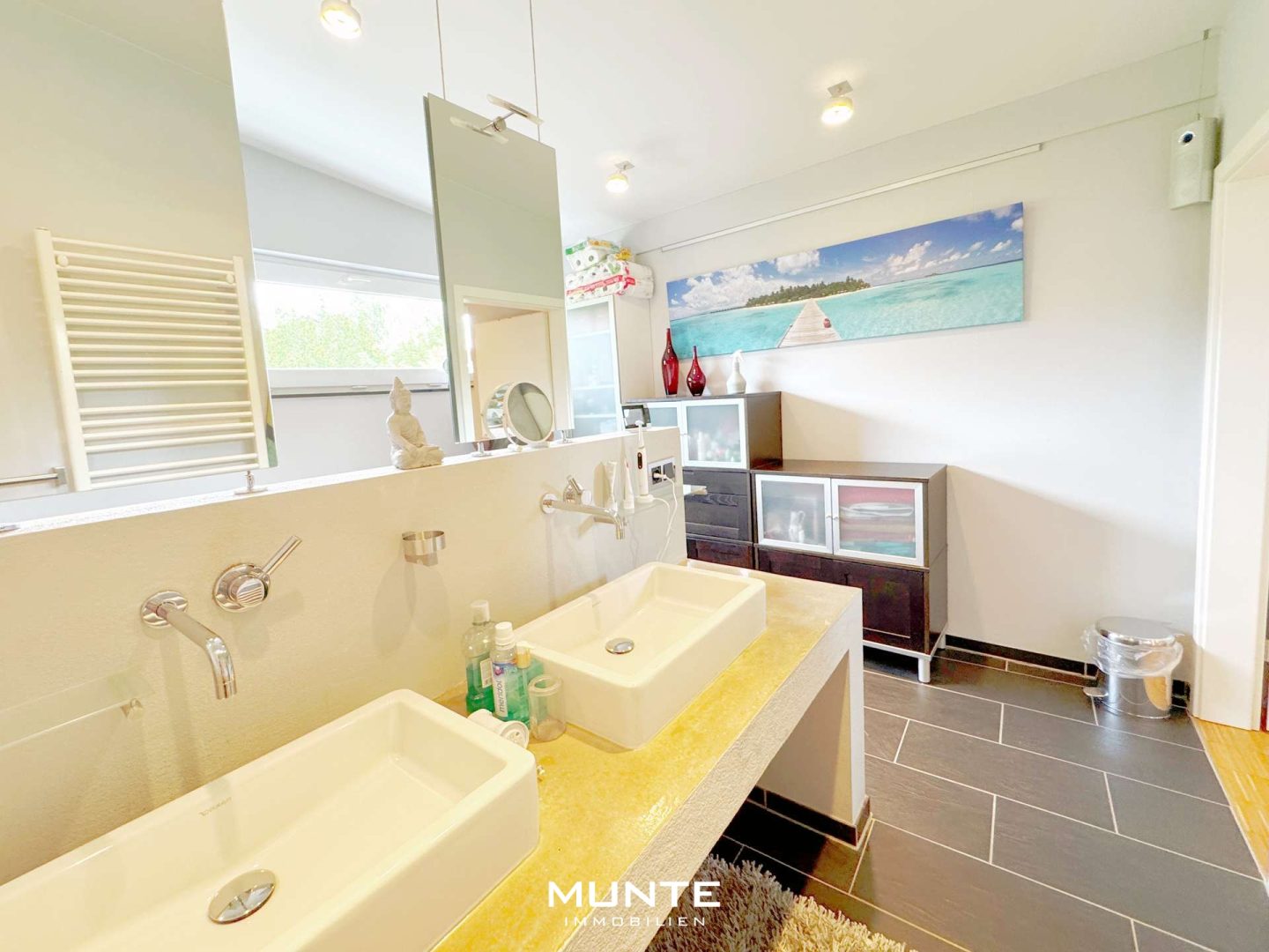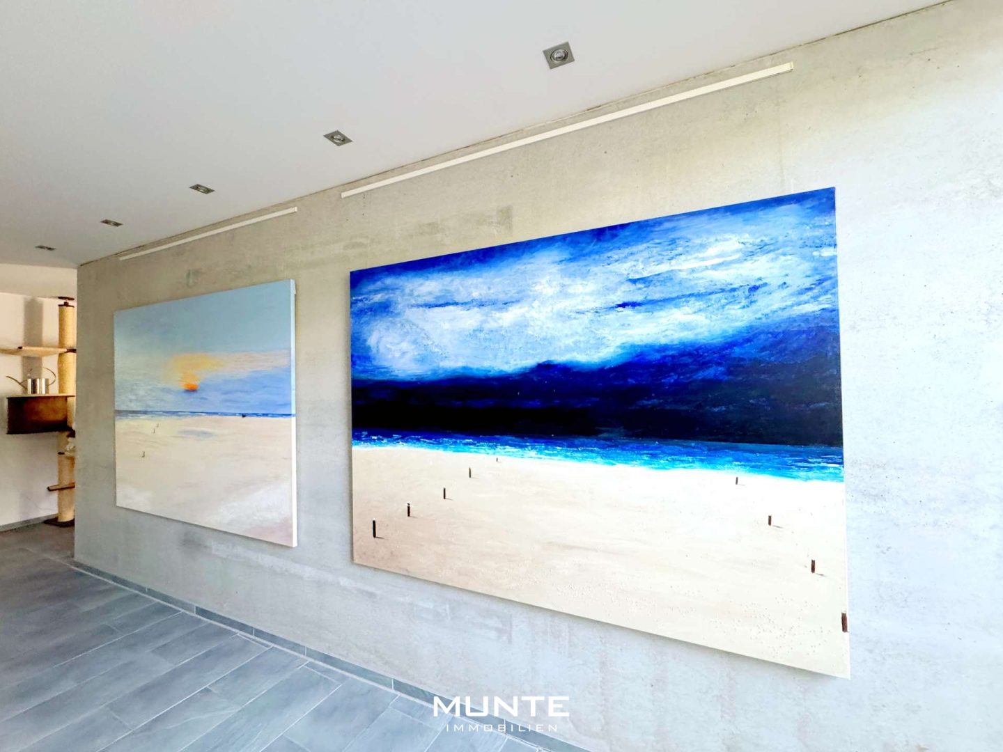 Rechts gelangen Sie in der offen gestalteten Küche mit angrenzendem Essbereich. Die Einbauküche in Holzoptik ist nicht nur modern und funktional, sondern bietet durch die großzügigen Fenster eine helle Atmosphäre. Dank des durchdachten Grundrisses gelangen Sie direkt ins angrenzende Esszimmer. Die stilvolle Sichtbetonwand sorgt hier für einen besonderen architektonischen Akzent, während ausreichend Platz für einen großen Esstisch gesellige Abende mit Familie und Freunden ermöglicht. Von hier aus führt eine Tür auf eine der beiden Terrassen mit Gartenblick.