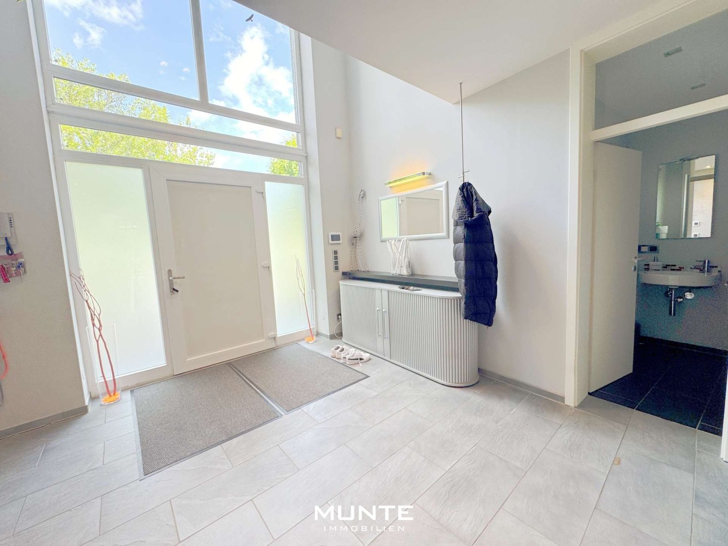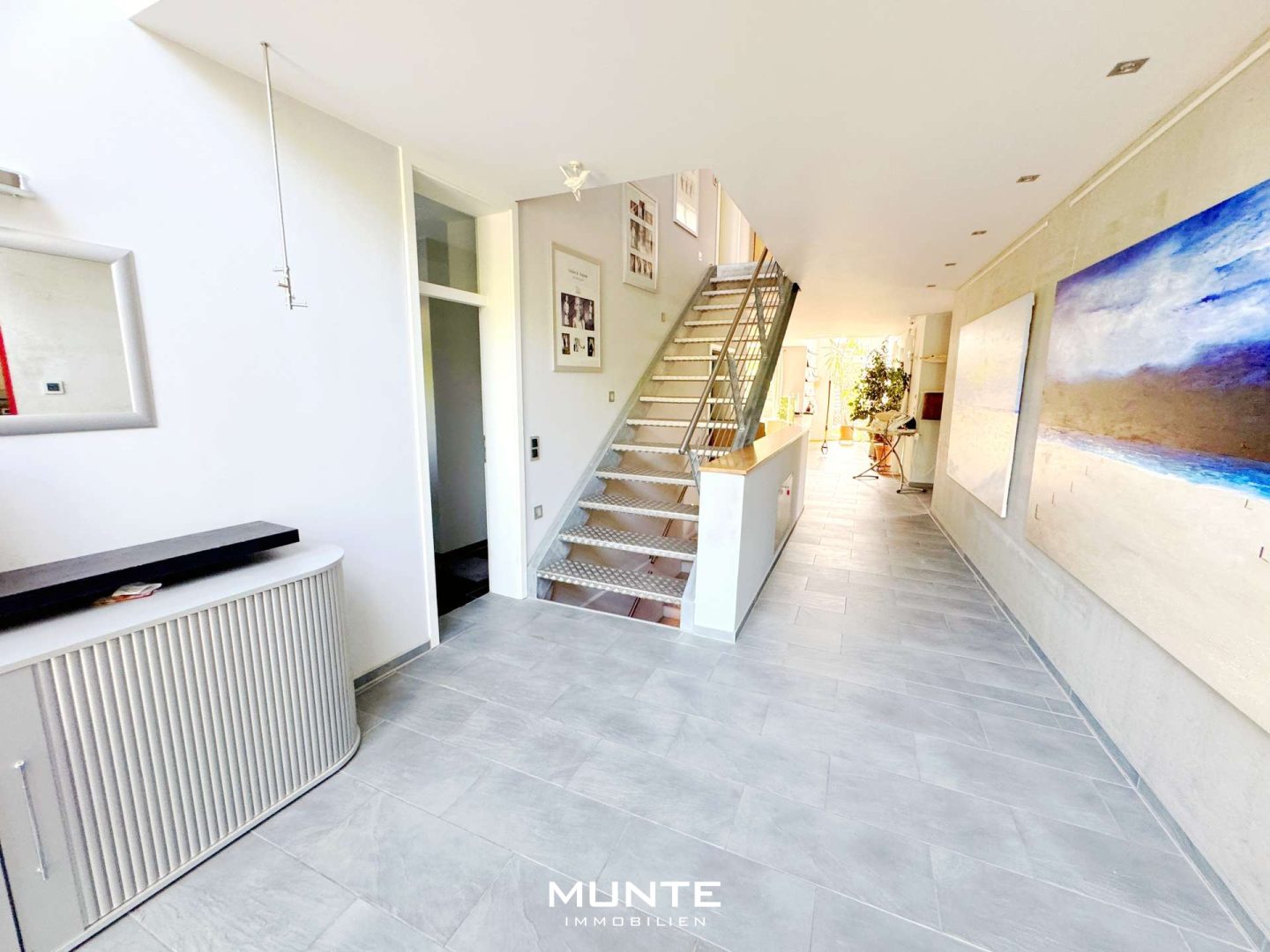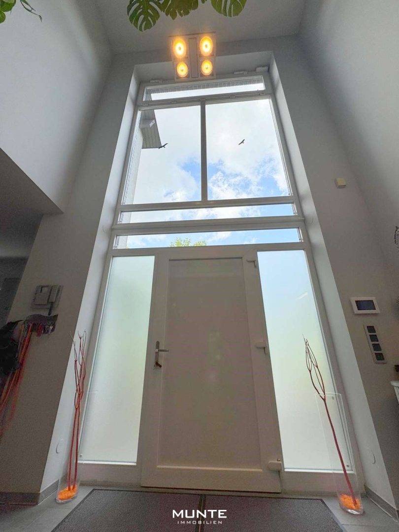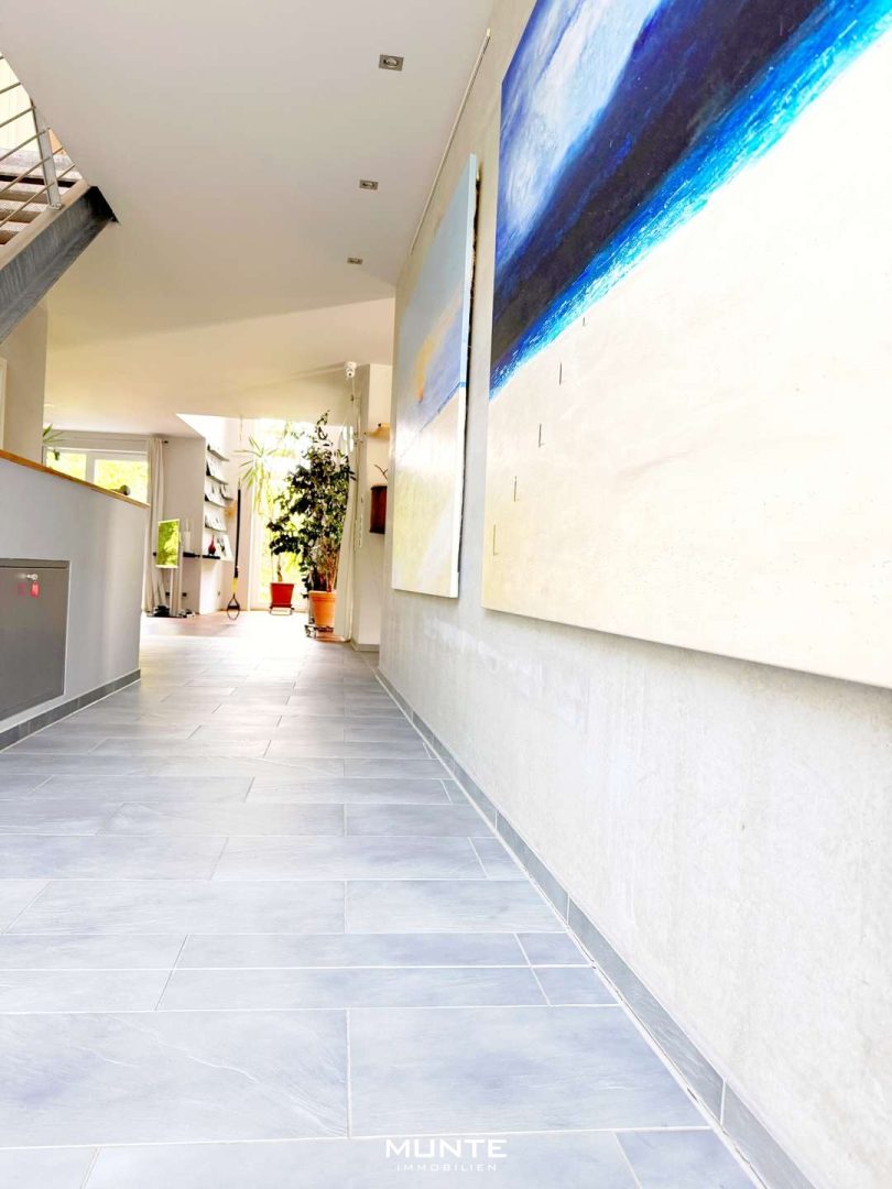 Der Zugang zum Haus erfolgt über einen charmant gestalteten Weg. Die Haustür erreichen Sie über eine kleine Stufe. Hinter der Eingangstür empfängt Sie ein offen gestalteter, hell gefliester Eingangsbereich mit direktem Blick auf die Galerie im Obergeschoss. Die moderne Treppe im Industrial-Stil zieht sofort die Blicke auf sich und setzt einen geschmackvollen Akzent. Zu Ihrer Linken gelangen Sie zu einem kleinen Gäste-WC.