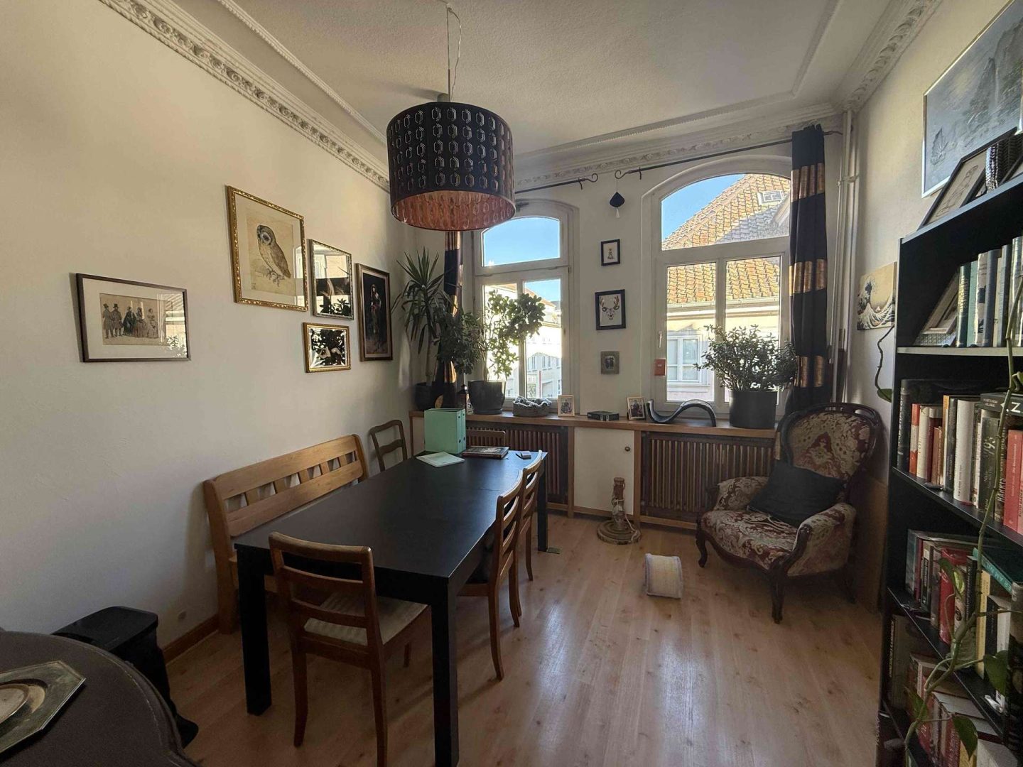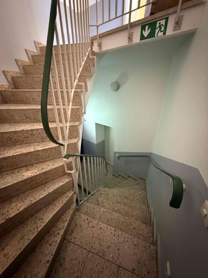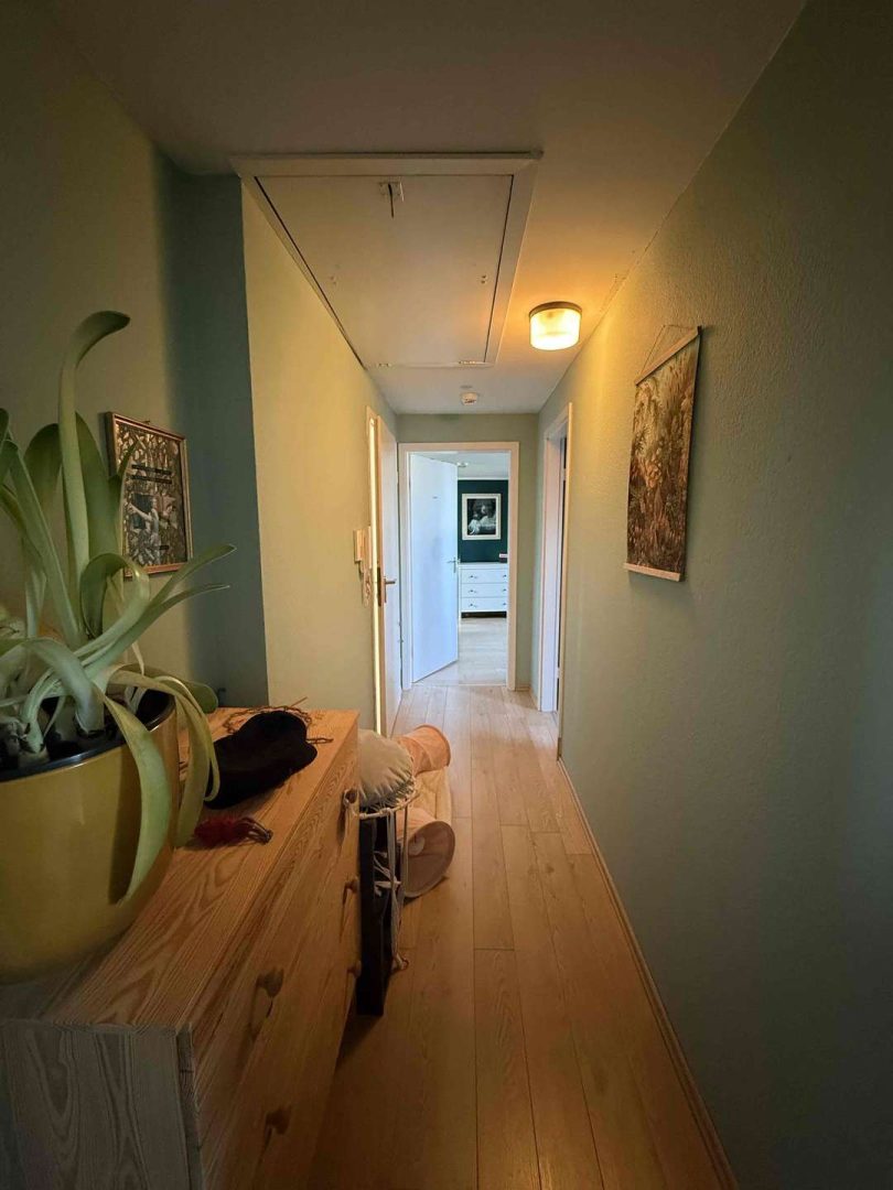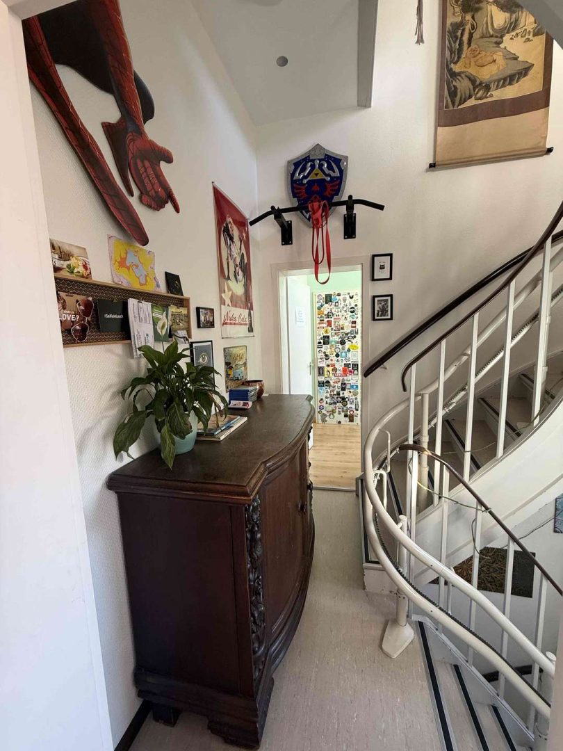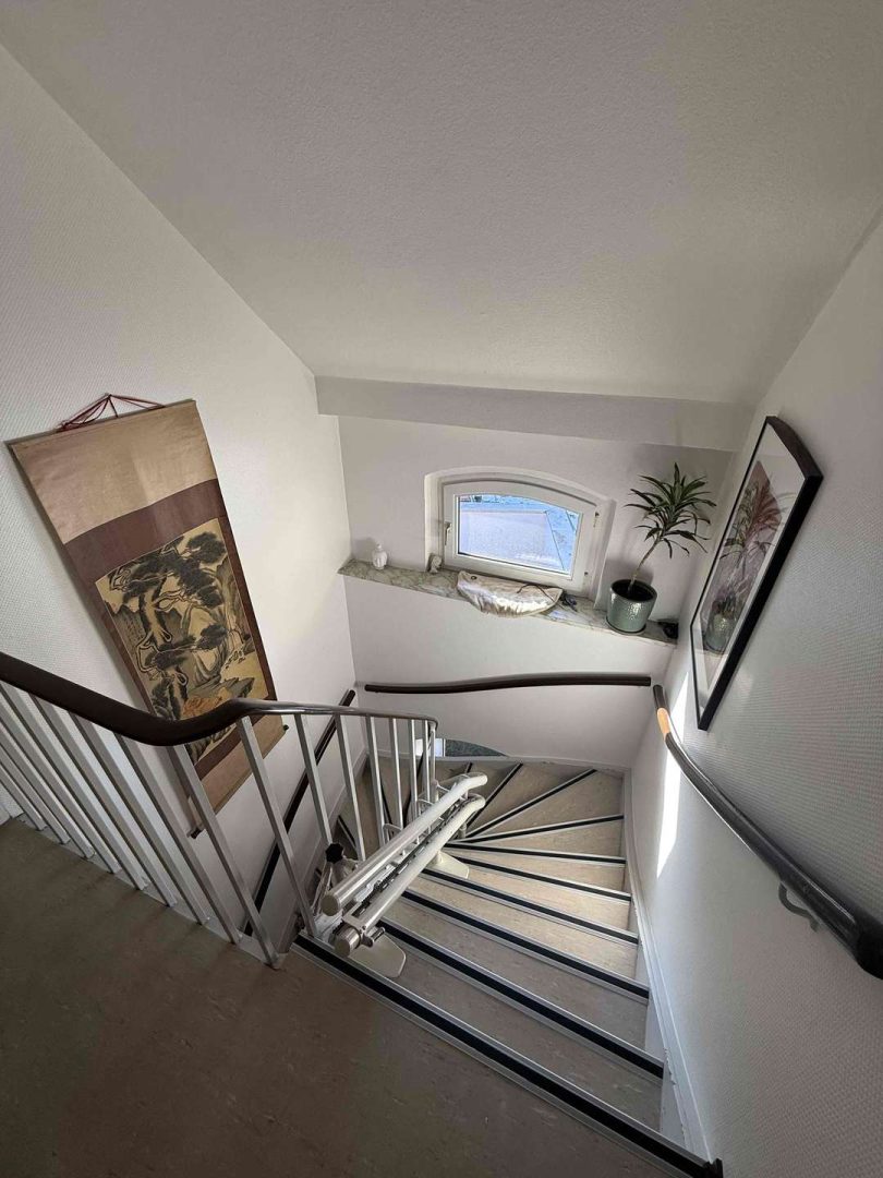 Im 2. und 3. Obergeschoss des Hauses befindet eine gepflegte und zur Zeit vermietete Maisonette-Wohnung von ca. 100 m², deren Wohnungszugang im 1. Obergeschoss liegt und die über einen seitlichen Hauseingang erschlossen wird. Die Wohnung ist gut geschnitten. Sie verfügt über eine moderne Einbauküche, eine kleine Dachterrasse Richtung Innenhof, ein Wannenbad mit separater Dusche, ein Gäste WC, originale Stuckdecken im Wohn- und Esszimmer sowie einen Treppenlift ab Zugang der Wohnung, der zur Zeit nicht genutzt wird. Die Kaltmiete der Wohnung beträgt aktuell 680,- Euro pro Monat.