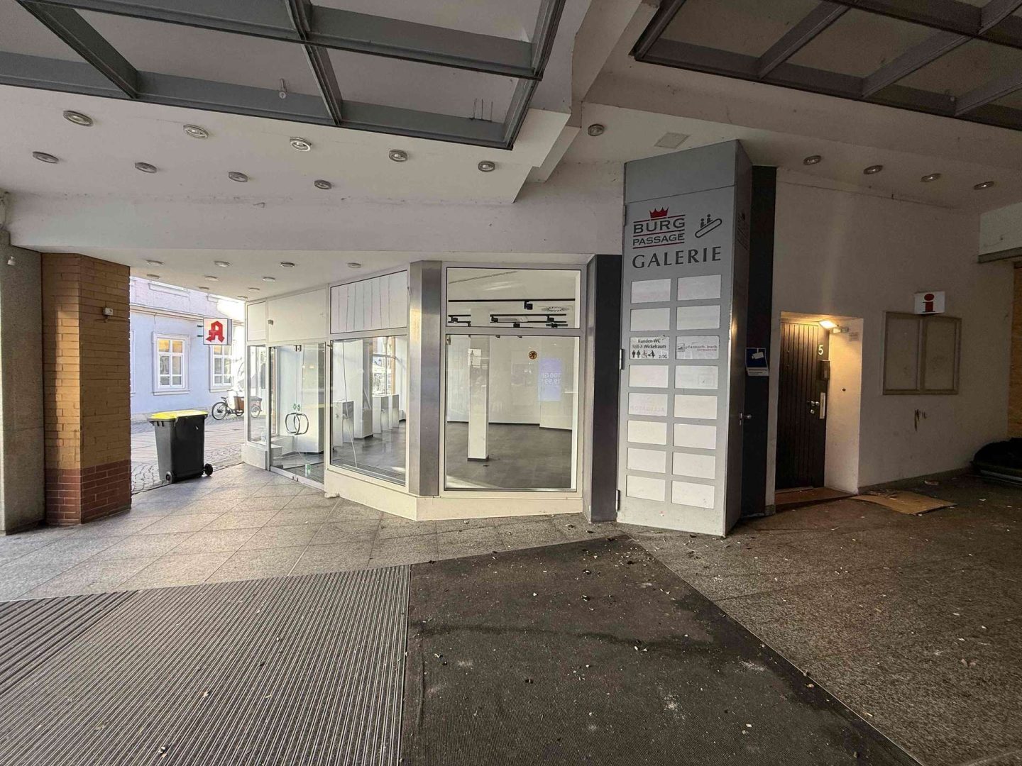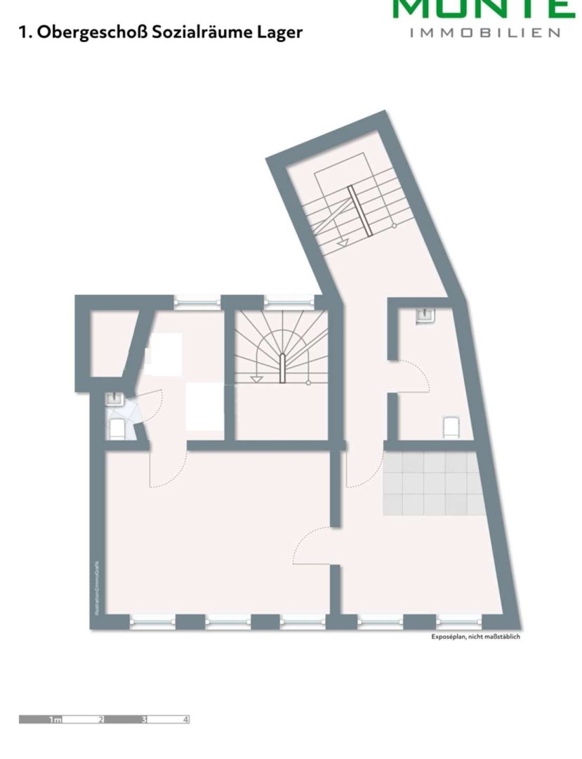 Im Erdgeschoß befindet sich eine Gewerbefläche mit ca. 80 m² und einer ca. 12 m breiten Schaufensterfront. Ein zusätzliches Oberlicht sorgt dafür, dass die Gewerbefläche schön hell ist. Sie kann vielseitig genutzt werden. Im 1. Obergeschoß liegen die dazugehörigen Büro- und Sozialräume sowie zwei WCs. Insgesamt beläuft sich die Gewerbeeinheit auf eine Fläche von ca. 135 m². Sie ist zur Zeit nicht vermietet und steht sofort zur Verfügung. Zu erzielende Mieteinnahmen liegen aus unserer Sicht aktuell bei ca. 3.000,- Euro pro Monat.